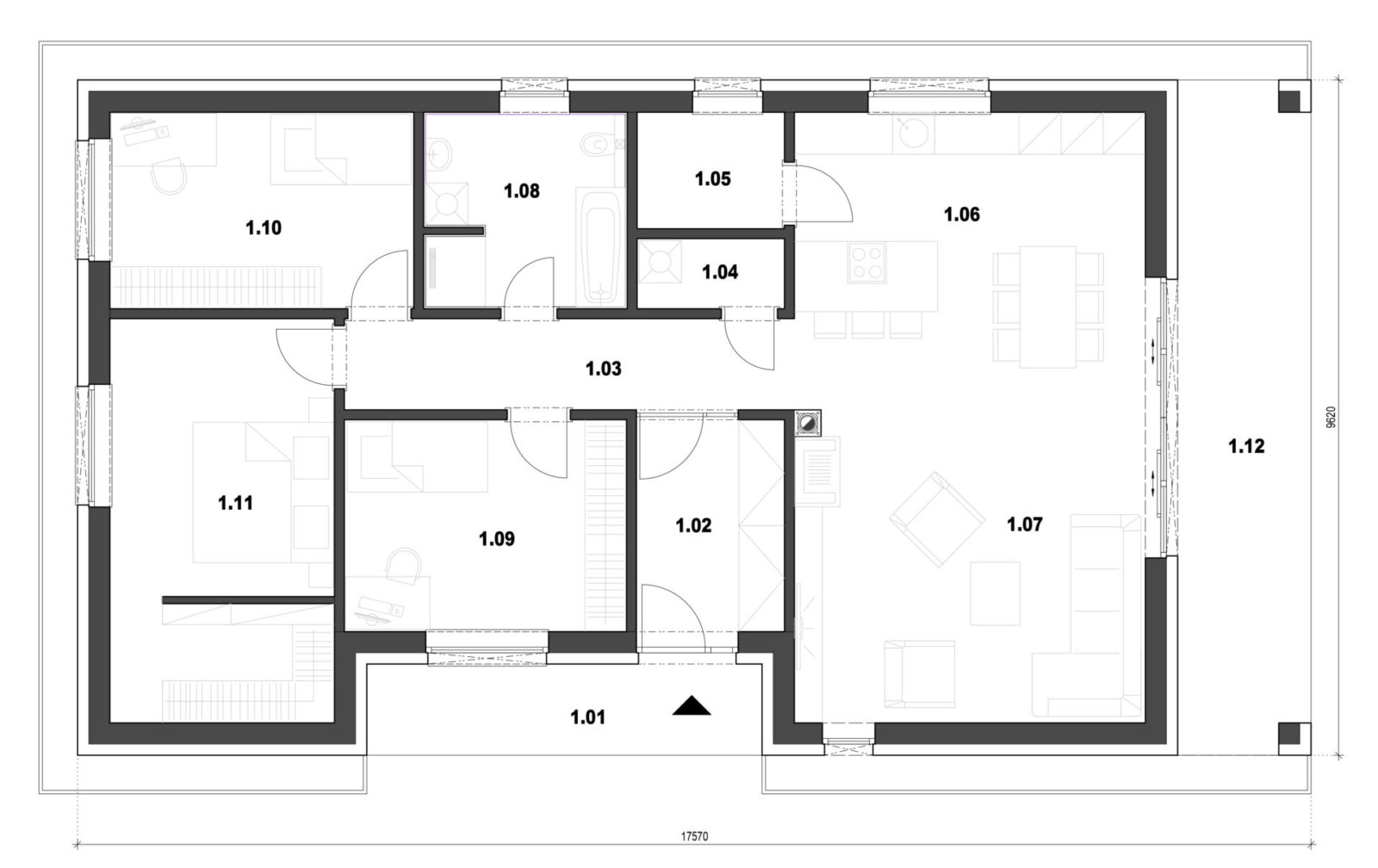 Vchod do domu je z bočnej strany prekrytý vsunutým závetrím. V zádverí domu sa nachádza odkladací priestor ako vstavaná skriňa. Dom je rozdelený na dennú a nočnú časť, ktoré je možno ľahko oddeliť aj dverami. V nočnej časti domu sa nachádzajú 2 detské izby, kúpeľňa s WC a spálňa so samostatným šatníkom. Dennú časť domu tvorí technická miestnosť, obývacia izba spojená s kuchyňou a jedálňou kde sa nachádza veľká špajza. Kuchyňa a obývacia izba sú orientované do záhrady, s ktorou ich spája terasa prekrytá vysunutím strechy. Dom je vhodný pre 4 – 5 člennú rodinu.